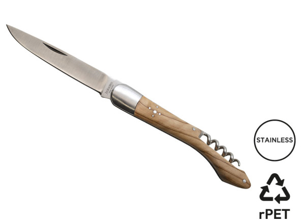 Folding pocket knife made according to very strict specifications: Blade in 440 stainsless steel, also known as 'surgical steel'. It is the perfect mix between chrome (to protect against rust) and carbon (to ensure sharpness). Razor's edge sharpened blade. Ribbed olive wood handle. Traditional tangstamping. Two full stainless steel forged bolsters. Stainless steel corkscrew. Heather grey RPET pouch included.