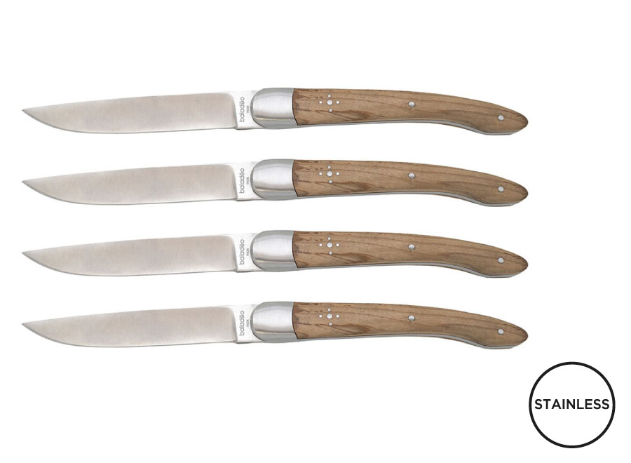 Steak knives made according to very strict specifications: Blades in 440 stainsless steel, also known as 'surgical steel'. It is the perfect mix between chrome (to protect against rust) and carbon (to ensure sharpness). Martensitic steel compliant with EN10088-2 2005. Ribbed olive wood handles. Two full stainless steel forged bolsters. Delivered in an gift box. Warning: This product is not dishwasher safe.