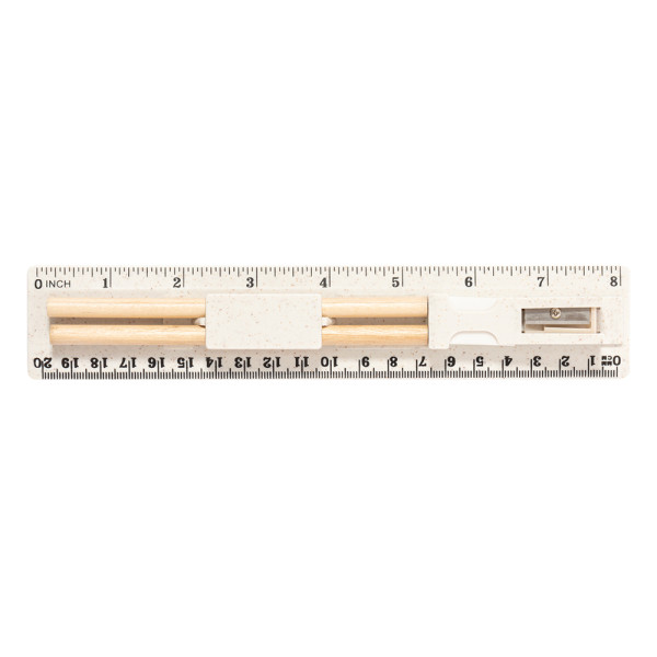 5-piece set made of wheat straw. Including 2 wooden pencils with black lead and white cylindrical body; eraser, and sharpener. Presented in a case with ruler of 20 cm/8 inches, with compartments for the different elements of the set. Individually packed in a white paper bag.Wheat straw promotes the use of natural raw materials, thus reducing pollutant emissions.