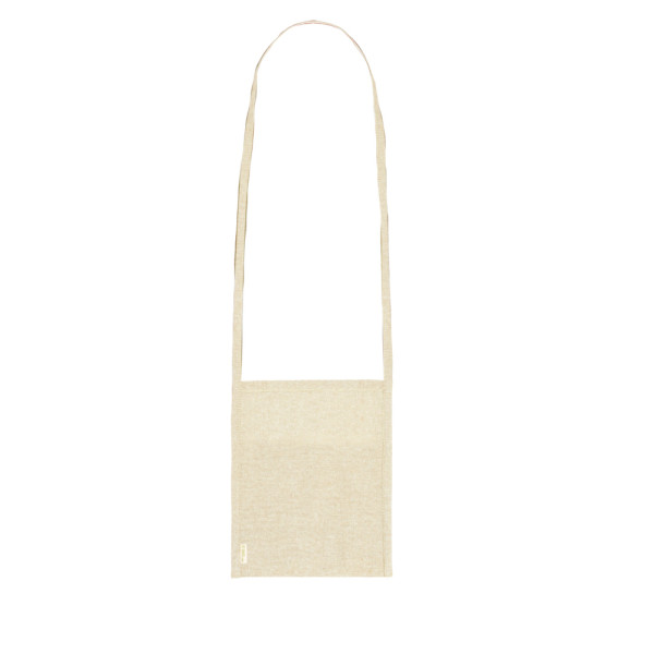 Practical multi purpose bag made of Recycled cotton. Versatile, with long handle and pocket to carry cups, glasses or any object comfortably. Available in different colours and made of soft Recycled cotton with distinctive label.