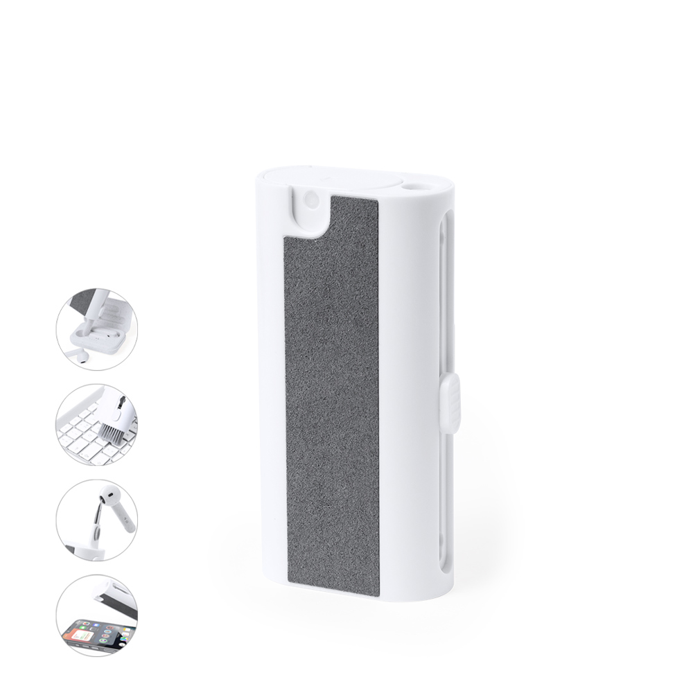 Complete 6-function cleaning set, specially designed for the care and maintenance of technological gadgets. All accessories are housed inside the case and are ready to use by sliding the button corresponding to each of them. Includes refillable inner deposit with sprayer, screen cleaning area, metal tip, cleaning stick, brushes in different shapes and key removal accessory. Made of resistant ABS, with elegant white design and presented individually in a kraft design box.