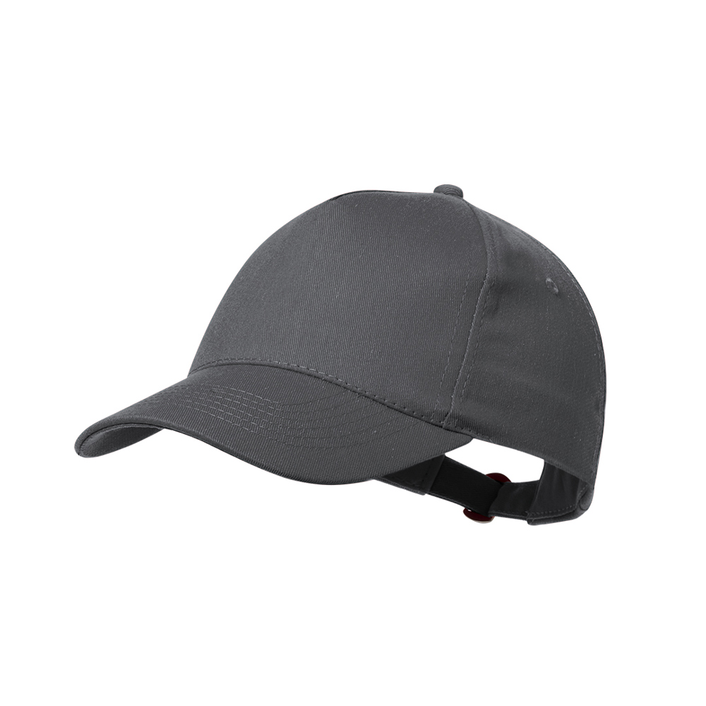 5 panel cap in recycled cotton with soft finish. With adjustable buckle fastening and embroidered ventilation holes. Available in a wide range of colours, with logo on label.