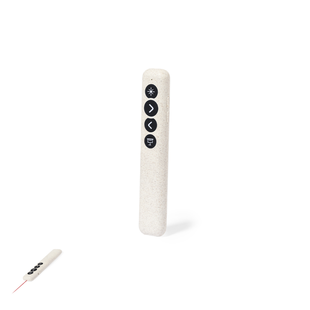 Stylish class 2 laser pointer with USB connection made of wheat straw. Specially designed for PowerPoint and Keynote presentations, with side activation button, forward, pause and rewind buttons. Body specially designed for pad printing branding. Battery powered: 1xAAA included. Presented in a kraft design box, with instruction manual in English and Spanish.Wheat straw promotes the use of natural raw materials, thus reducing pollutant emissions.