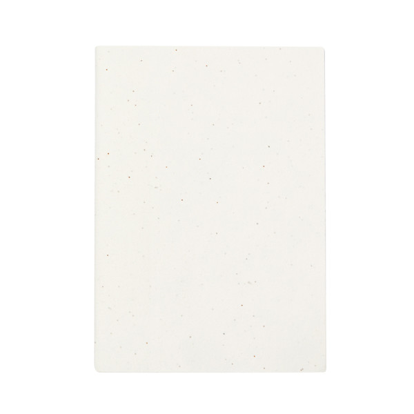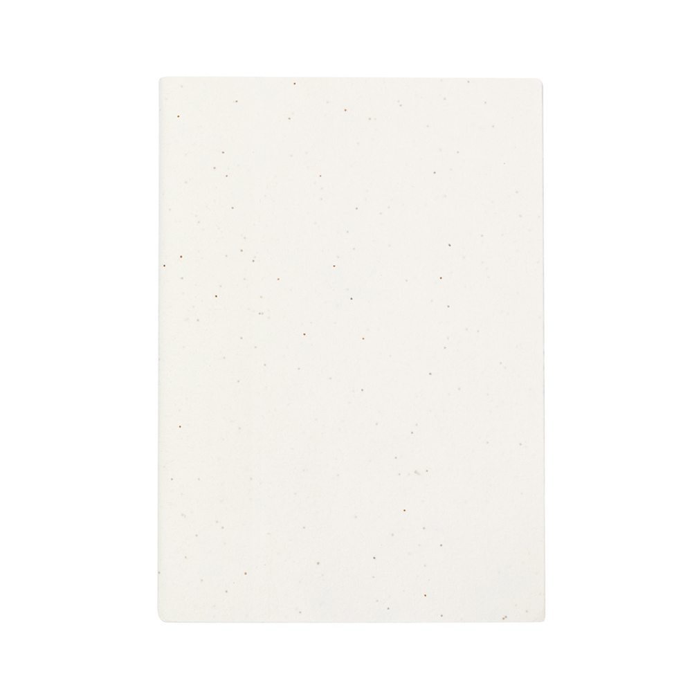 Notebook with soft covers made of seed paper and 60 plain white pages inside. Includes petunia seeds on both covers, making it a plantable paper at the end of its lifespan. With planting instructions and presented in an individual bag of recycled paper.
