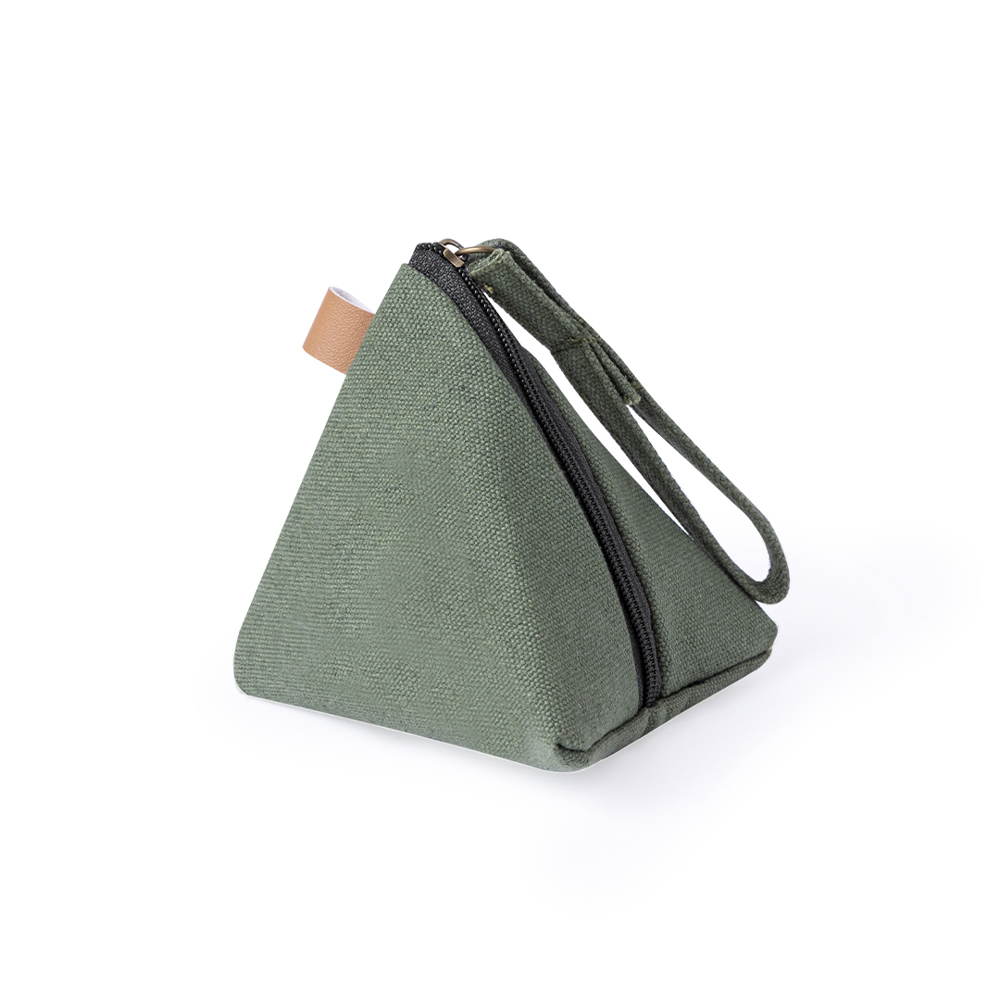Genuine pyramid shaped coin purse, made of durable canvas. Pocket with zip closure and long carrying strap. Available in different colours.