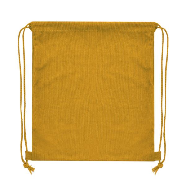 Drawstring backpack made of durable polyester corduroy. Stitched finish, with matching strings and side reinforcements. Available in a wide range of colours.