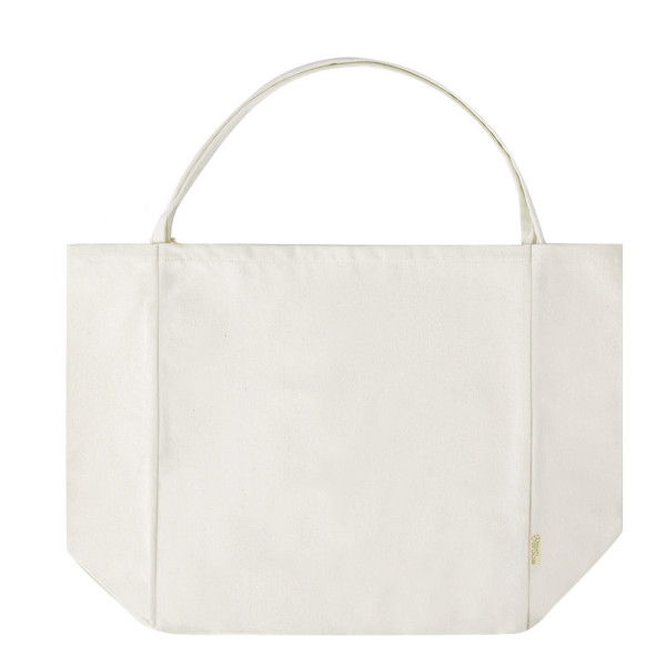 Bag in recycled cotton material 300 g/m2. Long handles of 60cm with reinforcement, stitched finish and gusset. Recycled cotton label and resistance up to 12 kg in weight. Available in natural colour.