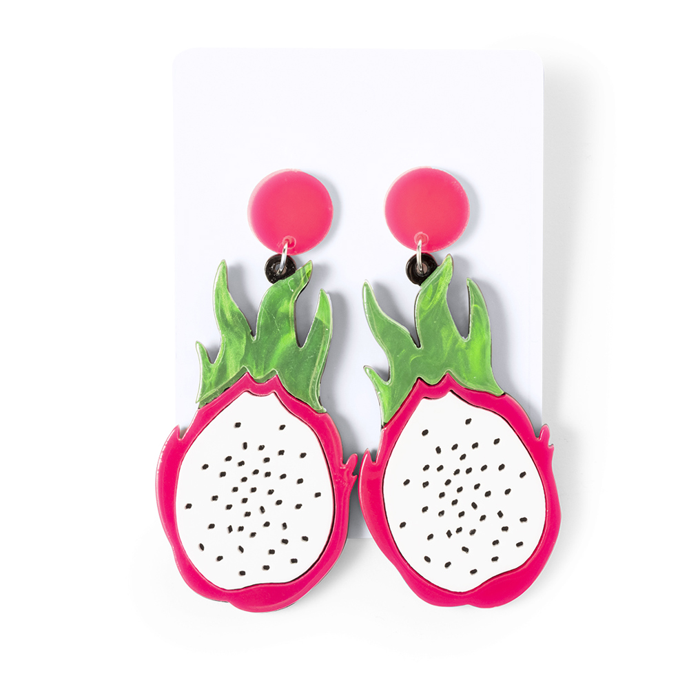 Fresh and original collection of fruit earrings. Captivating and colourful, shaped like strawberries, pitayas, apples, watermelons or lemons, making a style statement. Made with attention to detail and clip fastening. Presented in white cardboard and inside an individual bag.
