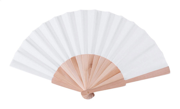 Polycotton hand fan with wooden ribs.