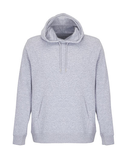 Outer Fabric: Combed organic cotton in conversion | Recycled Polyester | Cut and sewn | Set-in sleeves | 2x2 ribbed cuffs and bottom | Kangaroo pocket | Jersey half moon and neck tape inside collar | Jersey lined hood | Drawstring with metal eyelets and stoppers | Unbrushed Interior