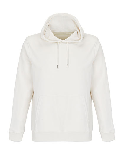 Outer Fabric: Combed organic cotton in conversion | Recycled Polyester | Cut and sewn | Set-in sleeves | 2x2 ribbed cuffs and bottom | Kangaroo pocket | Jersey half moon and neck tape inside collar | Jersey lined hood | Drawstring with metal eyelets and stoppers | Unbrushed Interior