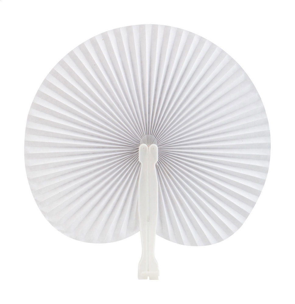 Paper hand fan with plastic stick.