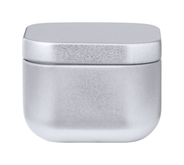 Vanilla scented candle in metal tin box.