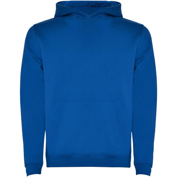 Two-colour hoodie with double fabric. Reinforced covered seams in collar and kangaroo style pocket. 1x1 elastane rib in cuffs and waistband. Removable label. The model is 120 cm and is wearing size 5/6.