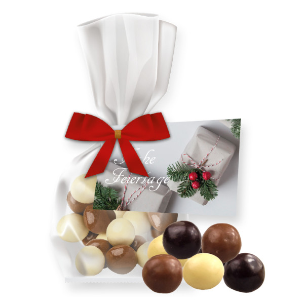 Choco crispy balls, ca. 30g, express flat bag maxi with bow with advertising card