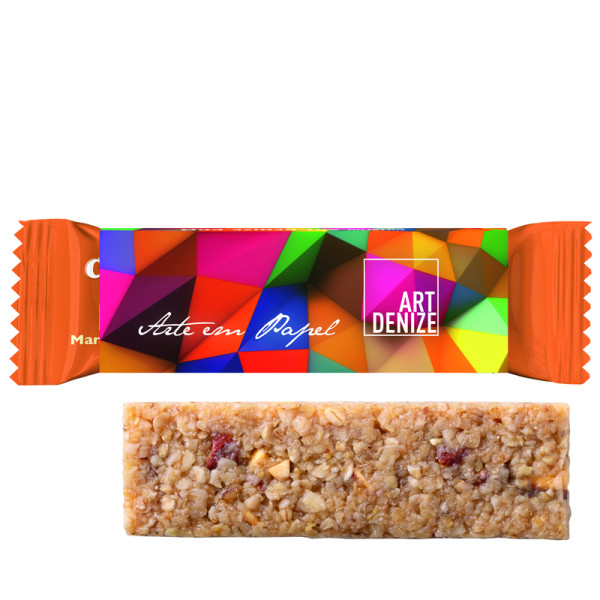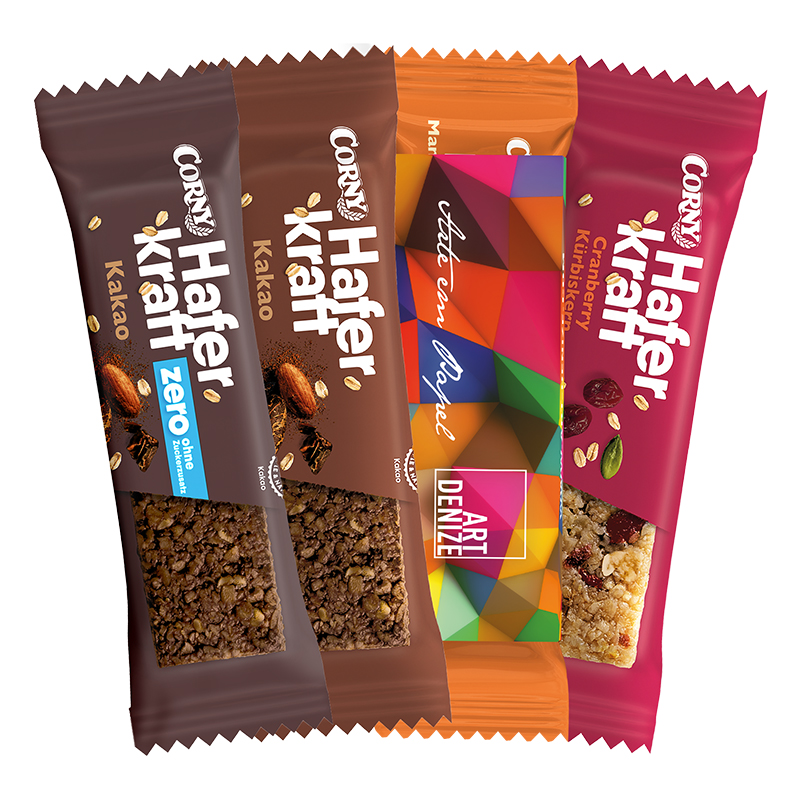 Promotional slipcase made of white cardboard, individually printed. Content: 1 Corny Haferkraft Bar, with at least 49% wholemeal, almond-caramel flavour, 35 g