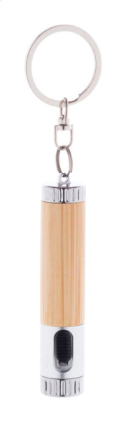 Bamboo and recycled ABS plastic mini flashlight with 1 LED and metal keyring. With button cell battery.