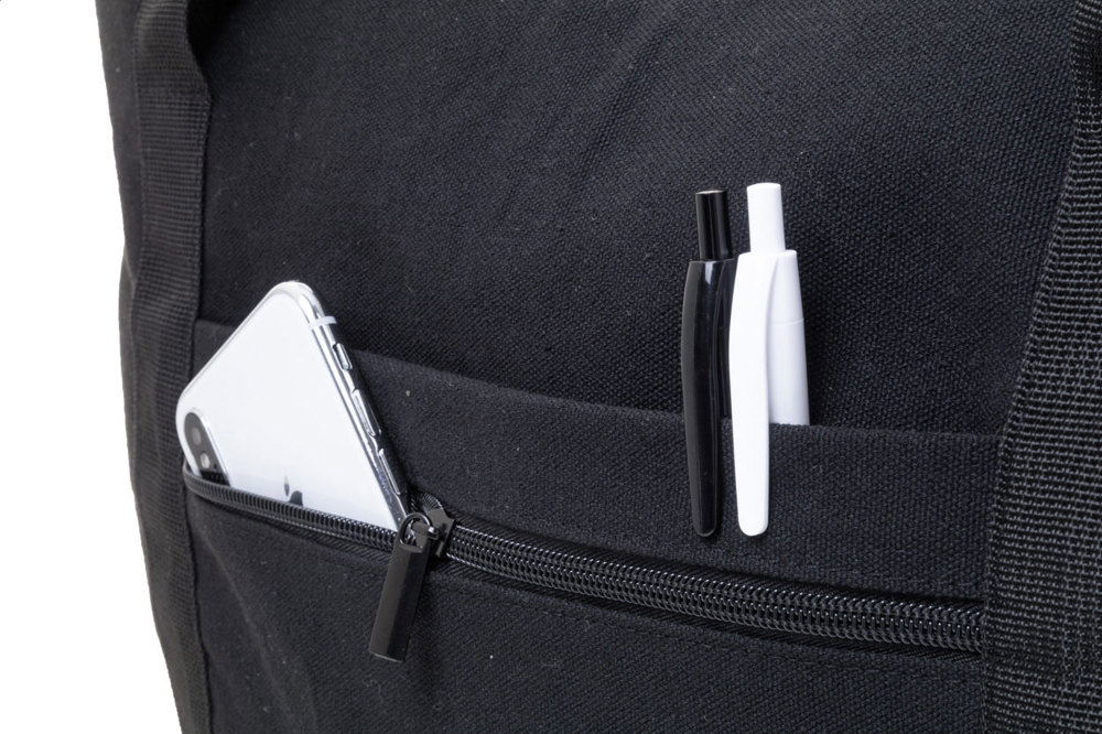 Recycled canvas travel / sports bag with zipped main compartment, front pocket, adjustable shoulder strap and zipped back pocket which doubles as trolley strap. 70% recycled cotton and 30% RPET polyester. With distinctive recycled cotton label.