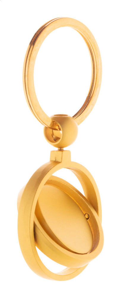 Metal keyring in golden finish with rotating inside part. In kraft paper box.