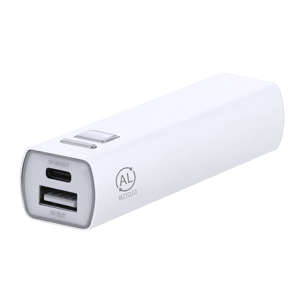 External auxiliary battery made of recycled aluminium, with a charging capacity of 2600 mAh. Easy to carry thanks to its small size, with ON/OFF button for charging control and Type C input/output connectors + USB output. Including LED charging light and Type-C cable. Available in a wide range of colours.The capacities shown in all our external auxiliary batteries are real, all of them incorporating non-recycled, grade A batteries, with a service life of at least 500 charging cycles, and complying with CE regulations. They are manufactured according RoHS standards, and in compliance with the following safety requirements: Power bank overcharge protection system. Complete discharge protection system, which increases the durability of the power bank. Blocking system to prevent short circuits. Constant charging transfer system, in accordance with the capacity of the target device.