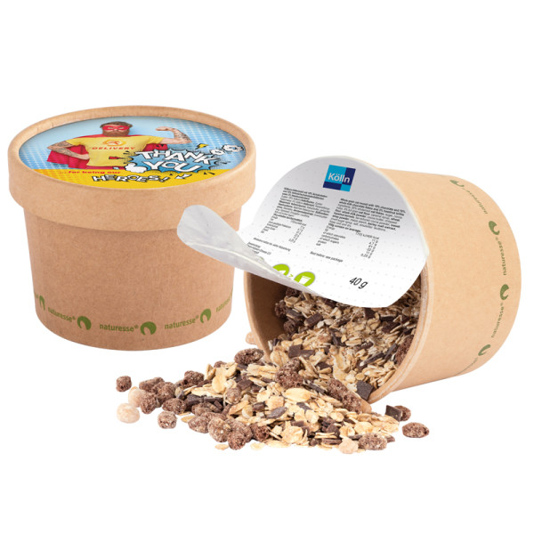 Muesli in a cup made of cardboard, individually printed. Content: Kölln chocolate oat-muesli... more