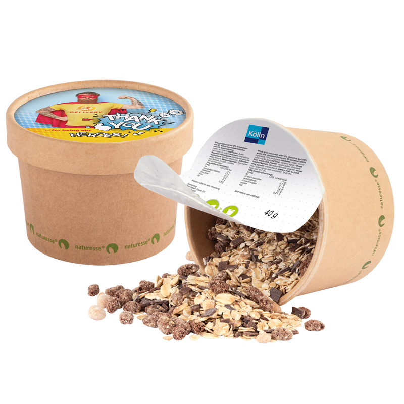 Muesli in a cup made of cardboard, individually printed. Content: Kölln chocolate oat-muesli (milk can be served into cup) , 40 g