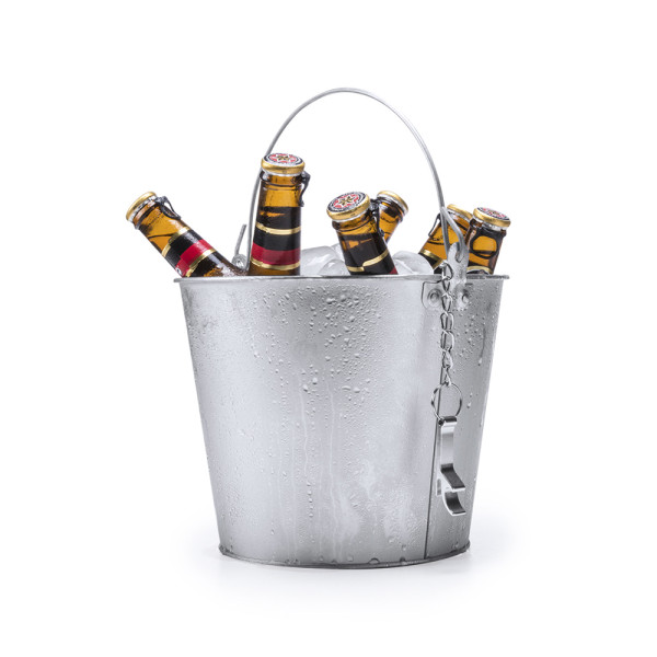 6l capacity metal bucket with handle and aluminum opener with chain included. more