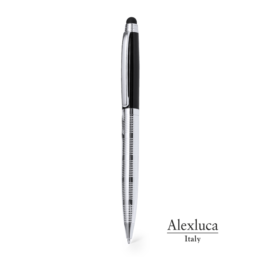 Pointer ball pen by Alexluca with twist mechanism, soft metal body and elegant combination of colors in silver and black. Clip and grip design in matching color. Presented in an individual black box with the brand logo. Blue ink.