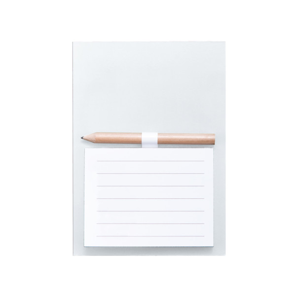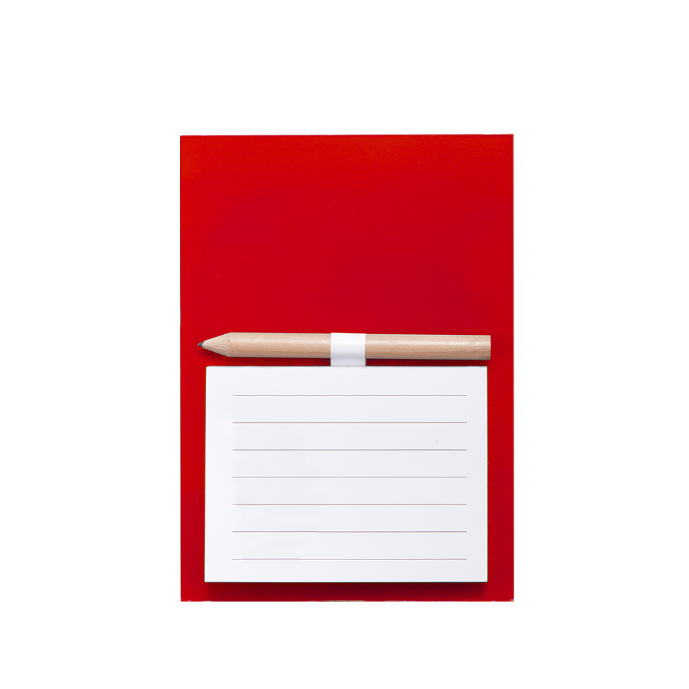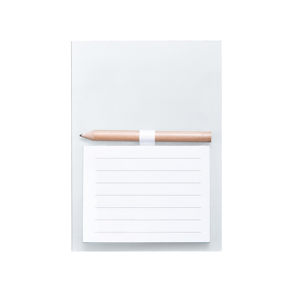 Magnet notepad in resistant cardboard of bright and varied colors. 40 sheets with striped design, with pencil and holder.