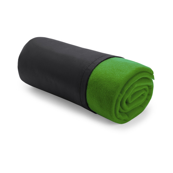 Blanket of 120x150cm in a varied range of bright tones. In polar fleece material of 180g/m2 with anti-pilling treatment and with a soft polyester, string closure sleeve.