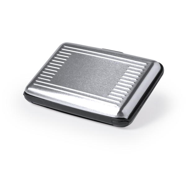 Card holder with RFID (Radio Frequency Identification) security technology that keeps card data safe. Resistant aluminum design, with 6 compartments and plain area on the outside designed for laser printing.