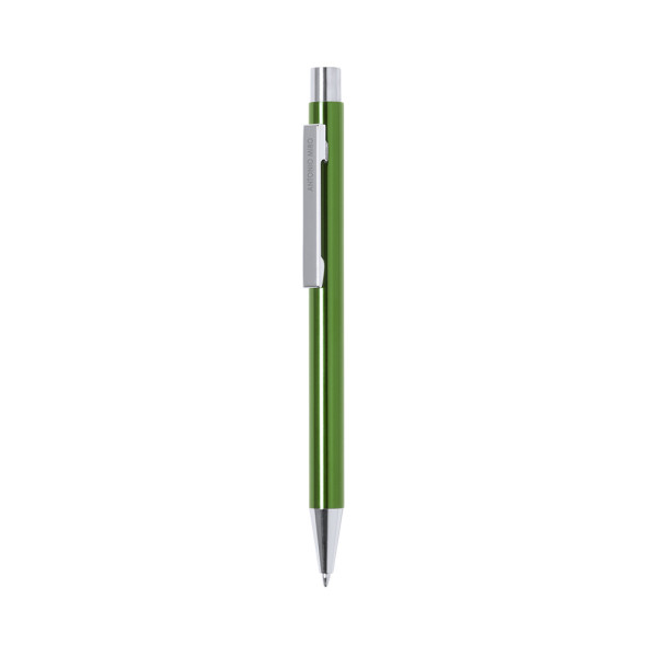 Ball pen by Antonio Miró with aluminum body in a wide range of bright tones and silver color. Push-up mechanism and presented in bag with the the brand logo. Blue ink.