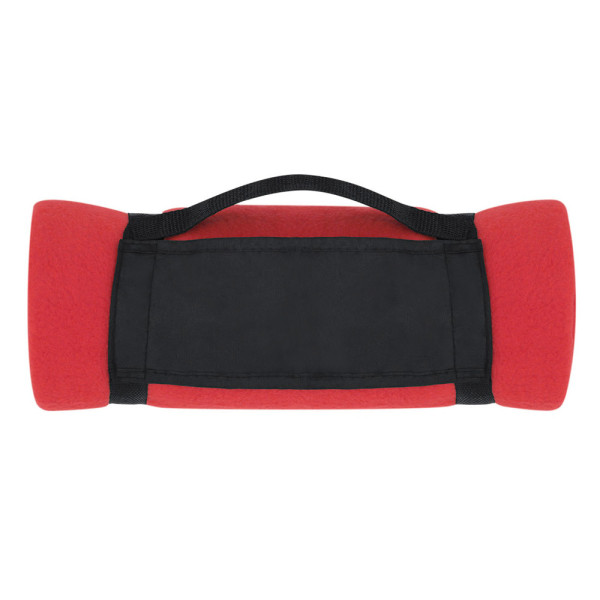 Blanket 130x160cm in a varied range of bright tones. In polar fleece material of 200g/m2 with anti-pilling treatment and carrying handle with velcro closure in soft polyester.