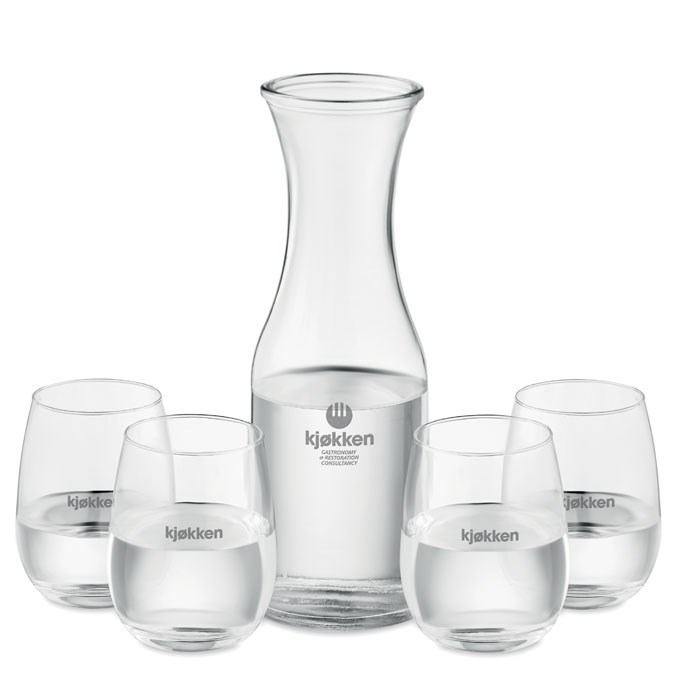 Recycled glass drink set. Including: Carafe (1L) with cork lid and 4 glasses (420 ml). Cork is 100% natural material. Due to its structural nature and surface porosity the final print result per item may have deviations.