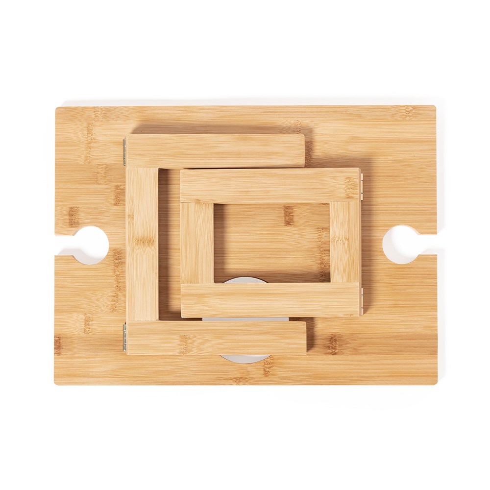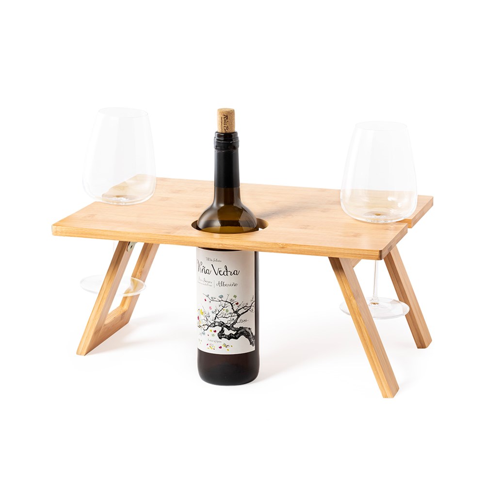 Folding table for wine lovers. Made of bamboo, including a compartment for a 75cl bottle and 2 glass holders. Easy to fold and compact in size, presented in an attractive, eco-designed individual box.
