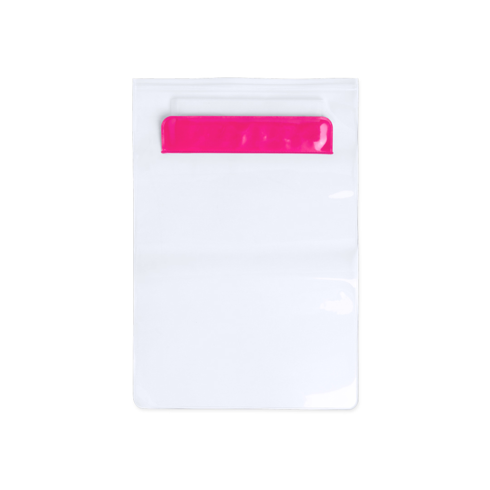 Practical waterproof, multi purpose, XL size, PVC bag with tactile surface, especially designed for tablets up to 9.7 inches and with double safety system for watertightness. With front flap in a wide range of colors.