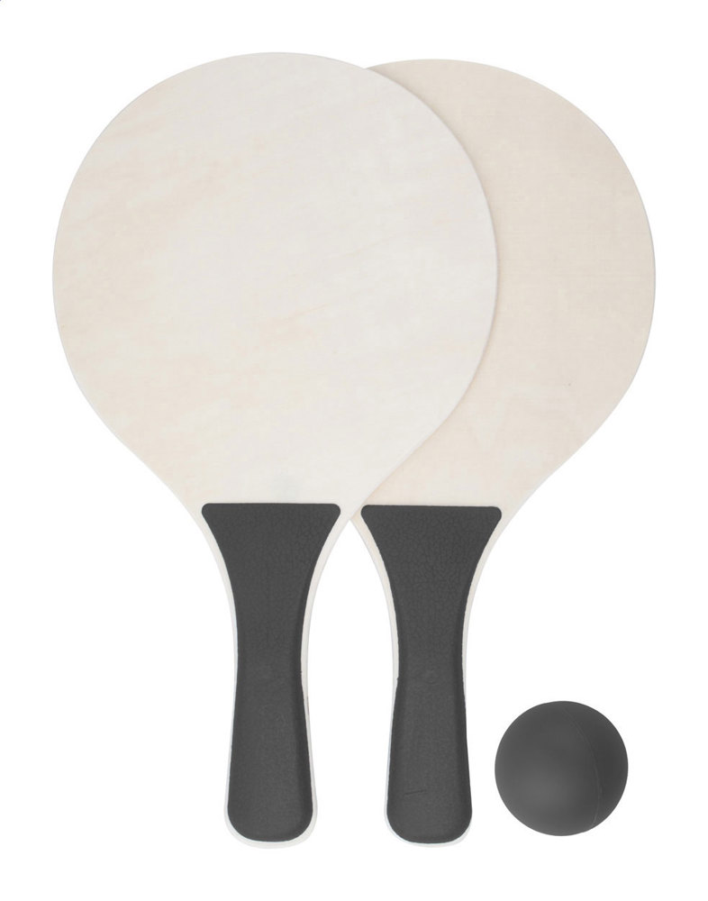 Beach tennis with 2 rackets and one ball, made of wood and plastic.