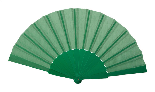 Textile hand fan with plastic ribs.