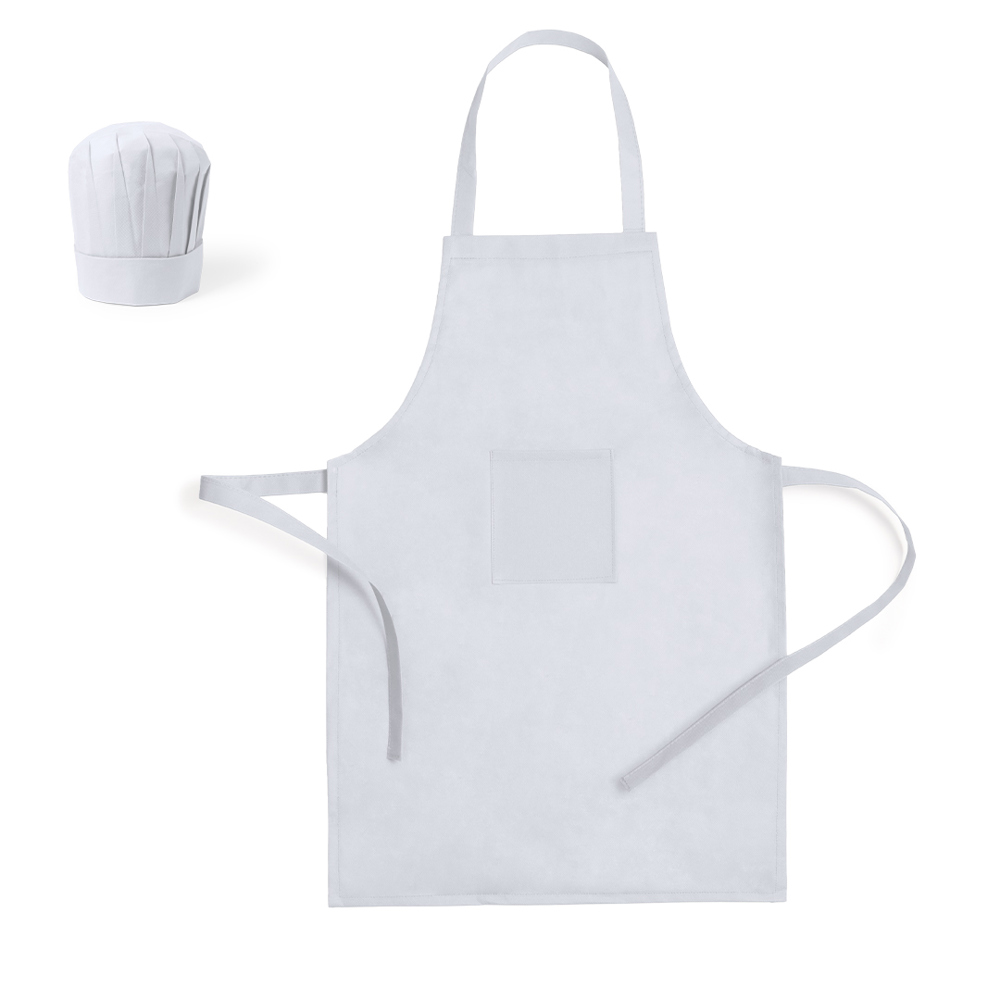Children´s set of apron and kitchen hat in brightly colored non-woven. Apron with front pocket and adjustment straps.