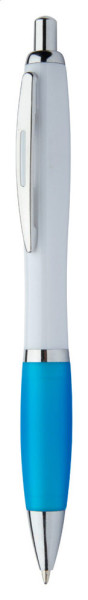 Plastic ballpoint pen with white barrel, coloured grip and shiny chrome parts. With blue refill.