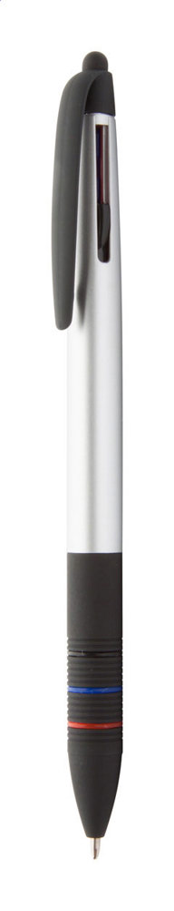 Plastic ballpoint and touch screen pen with rubberized grip and matte metallic finish. With 3 coloured refills: black, blue and red.