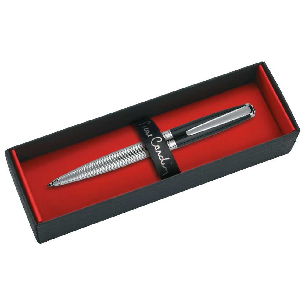 Luxus Pierre Cardin Schreibgerät aus Kupfer in massivem Design, als Rollerball Pen, Kugelschreiber oder Füllfederhalter erhältlich. Eine schöne Kombination aus Schwarz und Silber mit feinen Strukturen verzieren den unteren Teil der Stifte. Der Kugelschreiber hat einen Drehmechanismus, der Rollerball Pen ist durch eine Kappe geschützt. Der Rollerball Pen enthält eine 0,6 mm Mine in der Schreibfarbe Blau und eine Ersatzmine in der Schreibfarbe Schwarz. Der Kugelschreiber hat eine 1 mm Mine in der Schreibfarbe Blau und ebenfalls eine Ersatzmine in der Schreibfarbe Schwarz. Die Federstärke des Füllfederhalters ist Größe M, im Lieferumfang ist eine blaue Patrone enthalten. Verpackt in einer Pierre Cardin Luxus-Box, versendet mit Echtheitszertifikat. Empfohlene Veredelungstechnik: Lasergravur L1 Maximale Veredelungsgröße: 40 × 5 mm Abmessungen: Schreibgeräte: Ø 1 × 13,7 cm Verpackung: 17,5 × 6,7 × 3,5 cm Kartoneinheit: 20 Stück