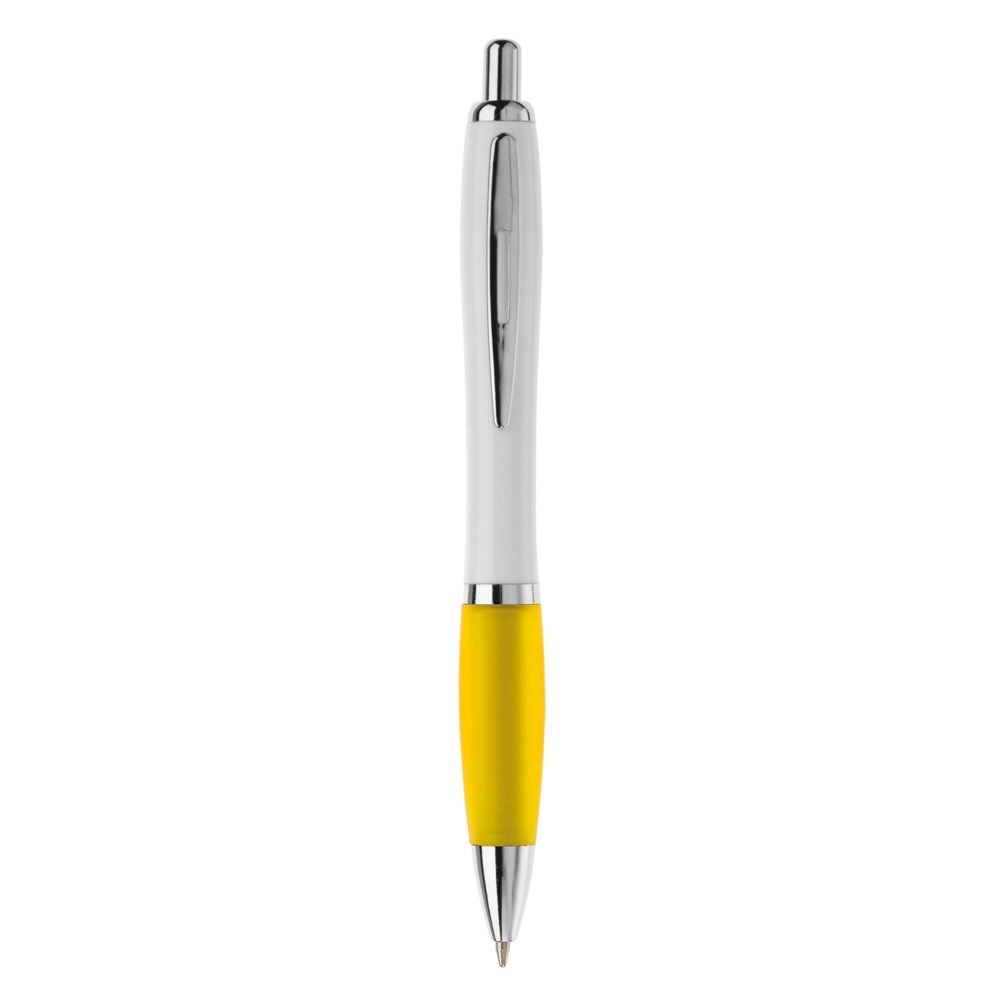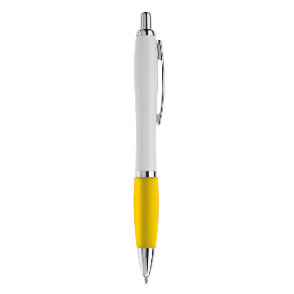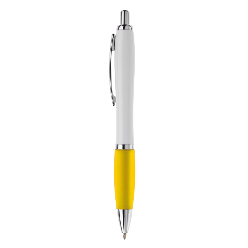 White ball pen with metal clip. Metal look push button, ring and tip. Comes with a Jumbo refill with blue writing ink.