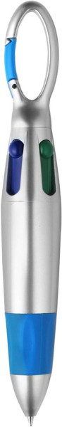 ABS ballpen with rubber grip, belt clip and four colors of ink: blue, red, black, and green.