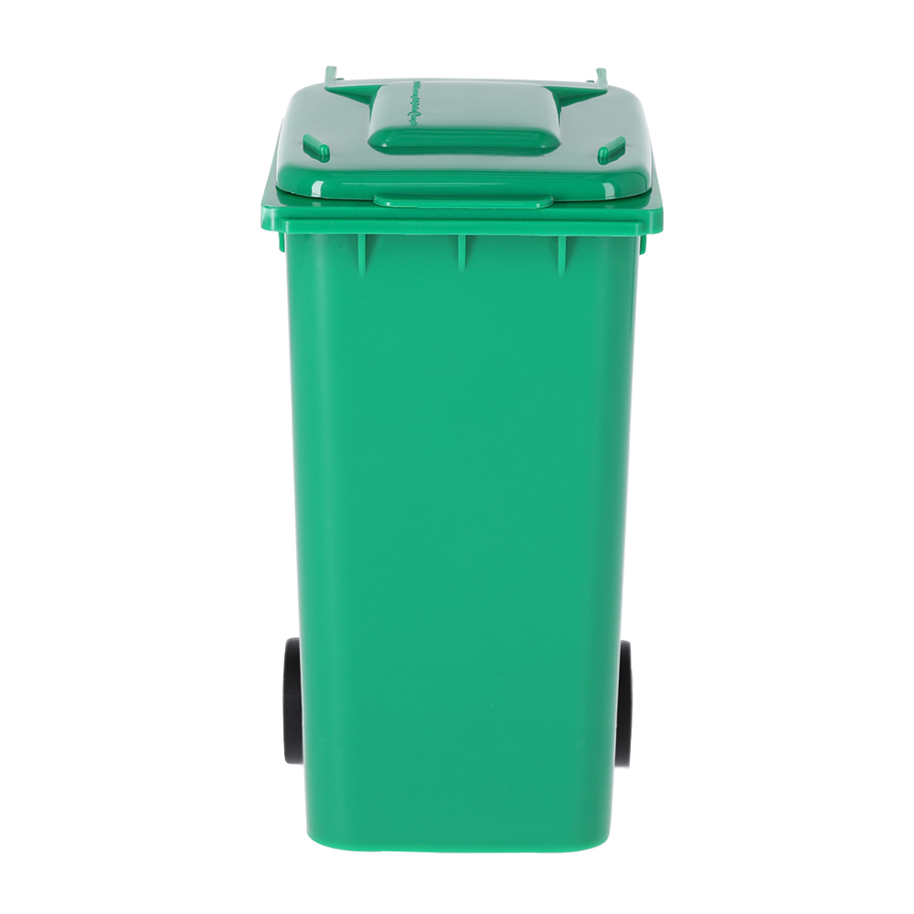 Pencil holder with wheels in the shape of a container in varied colors and with cover.