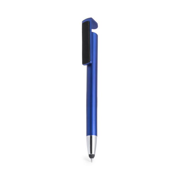 Multifunction ball pen with push-up mechanism in bold colors and dual-function clip especially designed to function as a holder for mobile devices and also as a screen cleaner. With body in metallic finish, especially designed for pad printing and black ink.