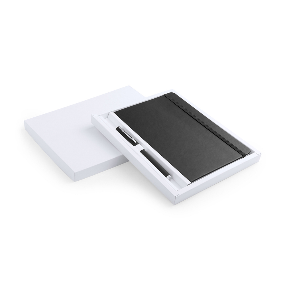 Notepad set with soft-touch covers in PU leather and matching color soft body pen. 100 blank sheets with elastic support and matching color fabric bookmark. Presented in an elegant white die-cut cardboard box. Ball pen with blue ink.