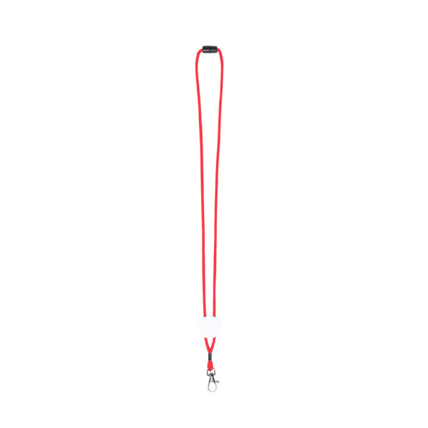 Lanyard in resistant and soft polyester string in a varied range of bright tones. With detachable snap closure on collar, metal carabiner accessory and central pad for printing.