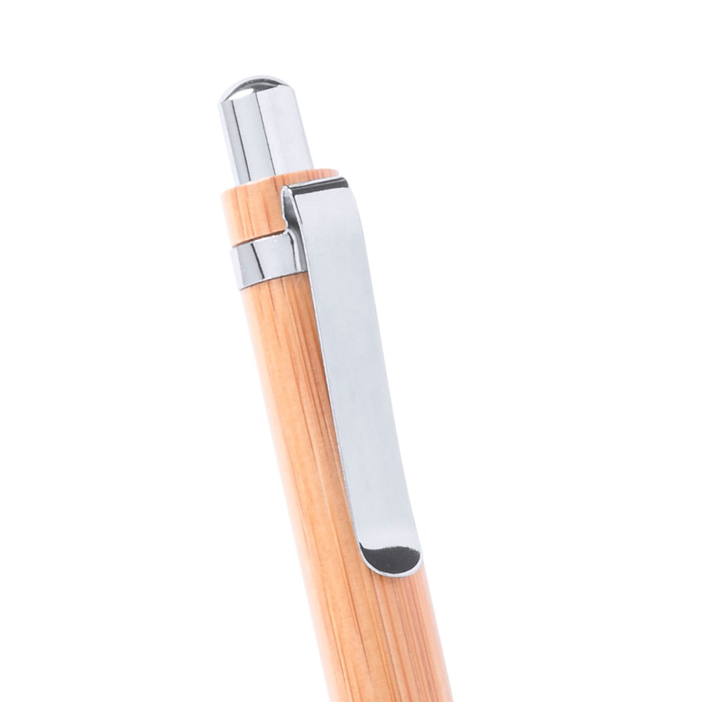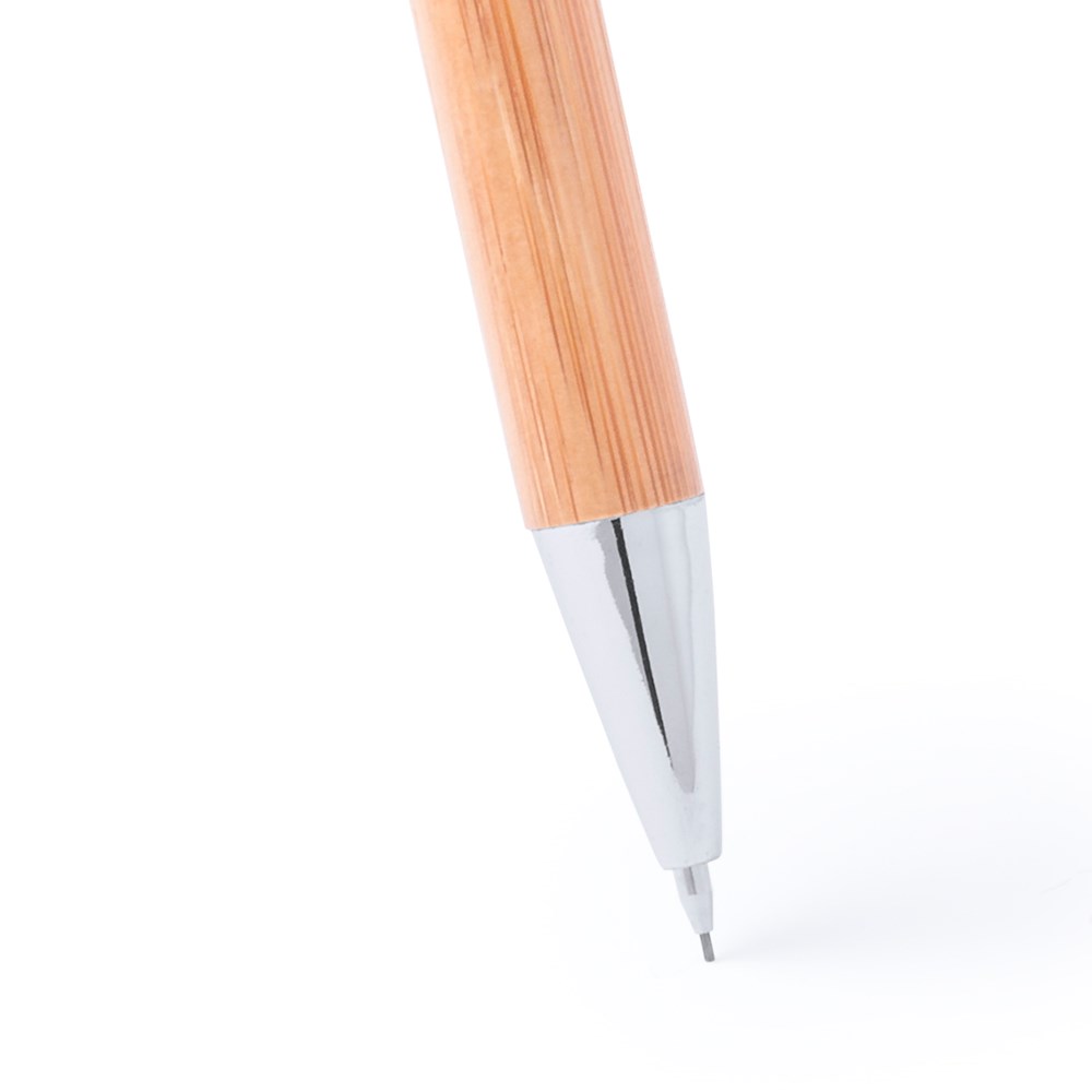 Set of push-up mechanism ball pen and mechanical pencil in an original combination of natural bamboo wood and metallic finish accessories in shiny silver color. Presented in a single, glossy cardboard die-cut case in wooden finishing. Jumbo cartridge ball pen with blue ink and 0.7mm lead included.