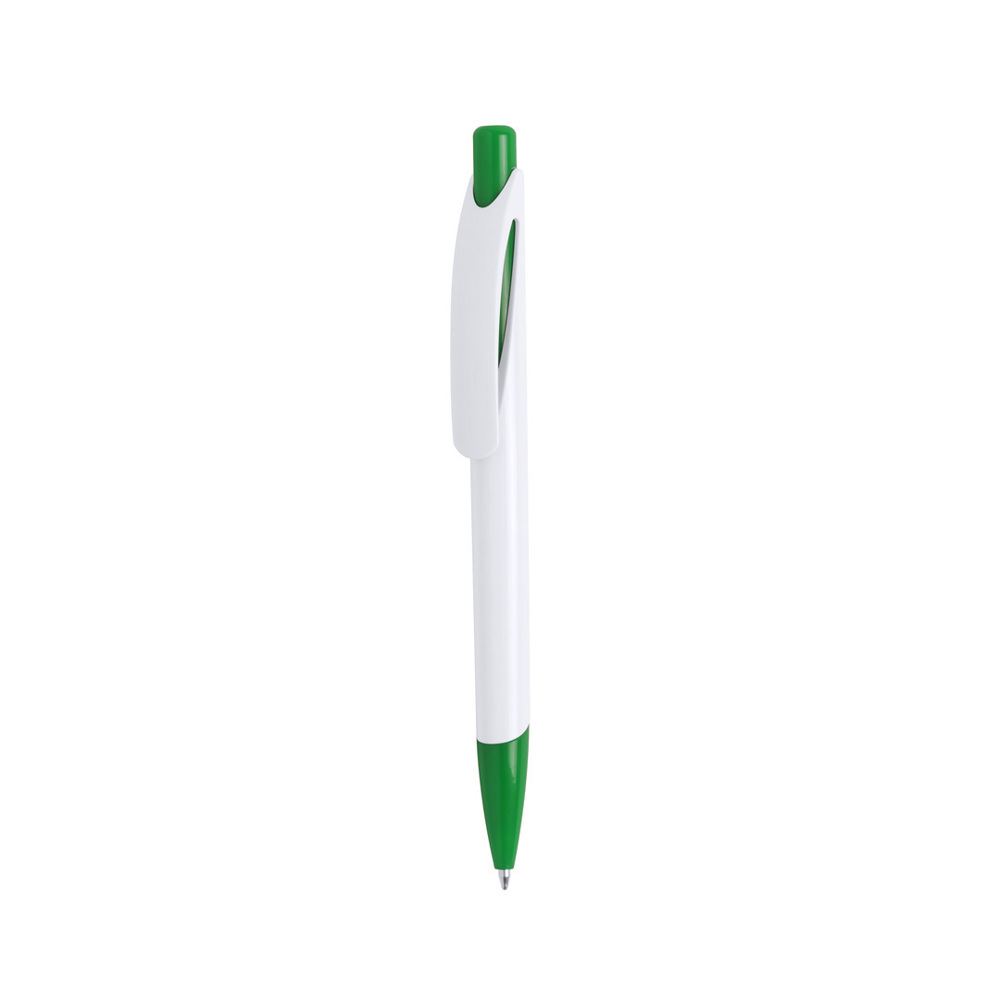 Push-up ball pen with bold bicolor design with accessories in bright solid colors and soft body in solid white. With original curved clip and matching color tip.